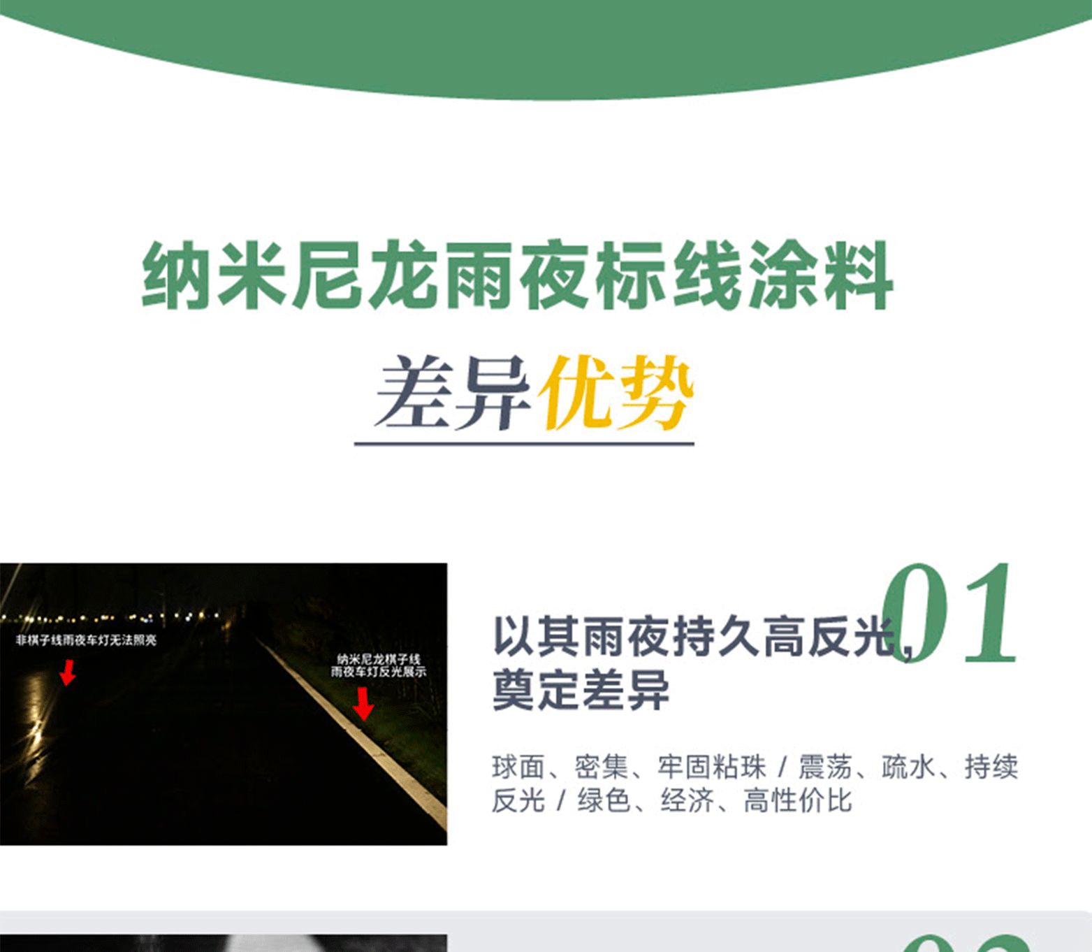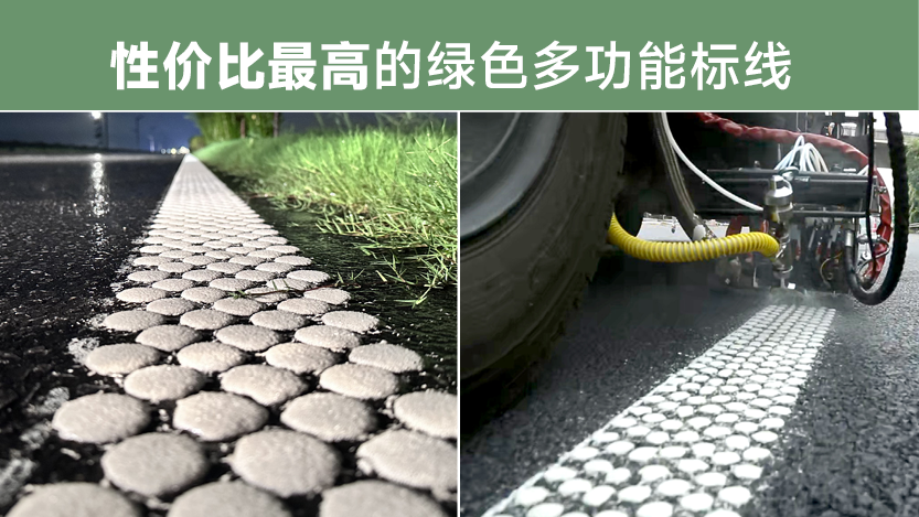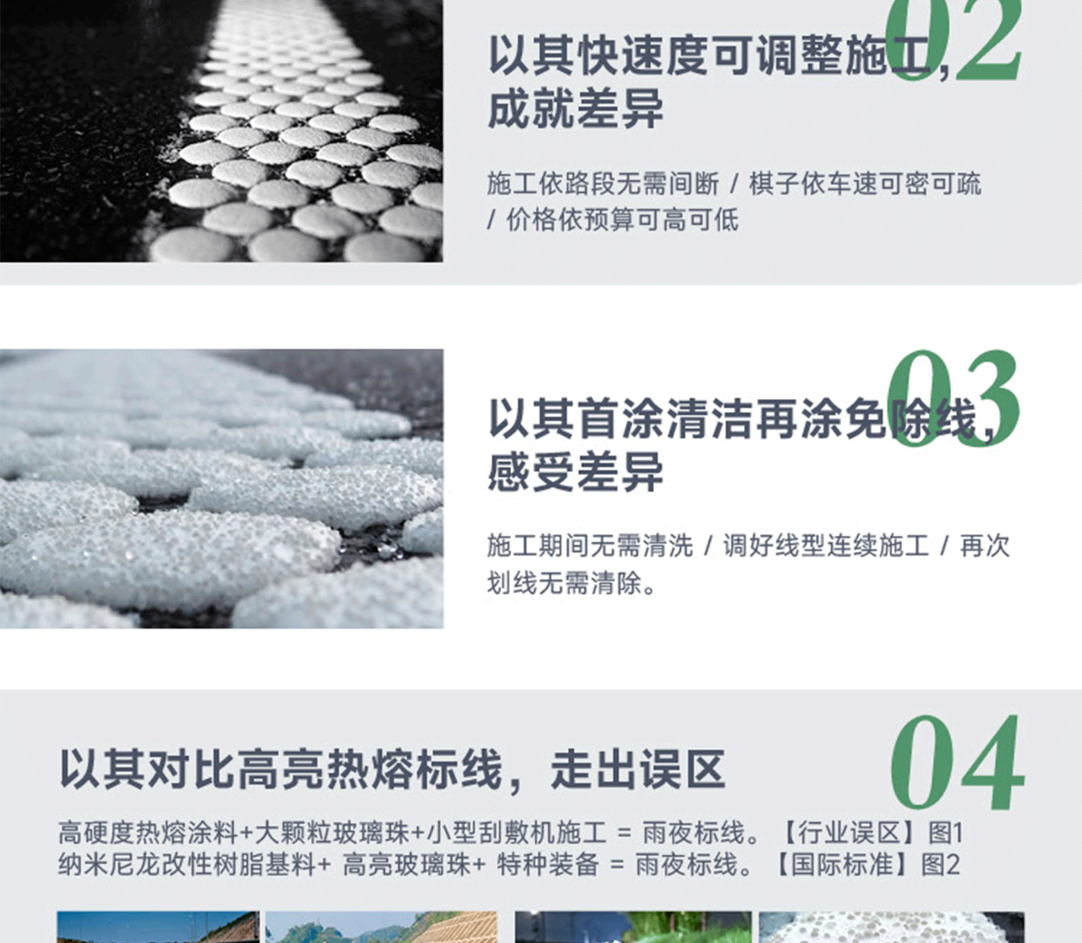 ?專家測評:納米尼龍雨夜標線涂料,結構密實不開裂,抗壓耐磨耐沖擊;雨夜,棋子凸起的弧面浮出水面,多角度立體反光,猶如雨夜燈帶,雨夜強視認;棋子均勻排列,無底線阻礙,雨水能從間距中快速排走,疏水護路、結構密實, 粘結力強,耐磨耐沖擊;標線壽命長,約是常規熱熔標線的1.5倍。