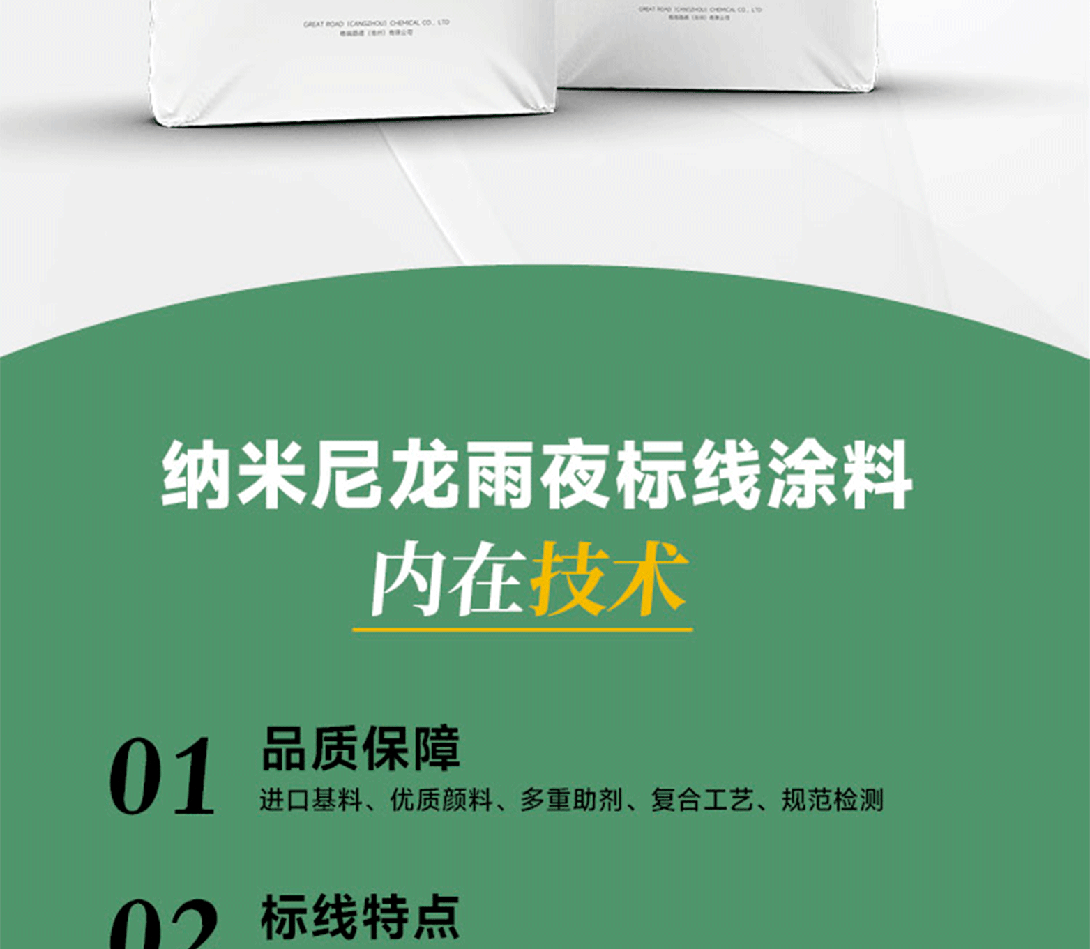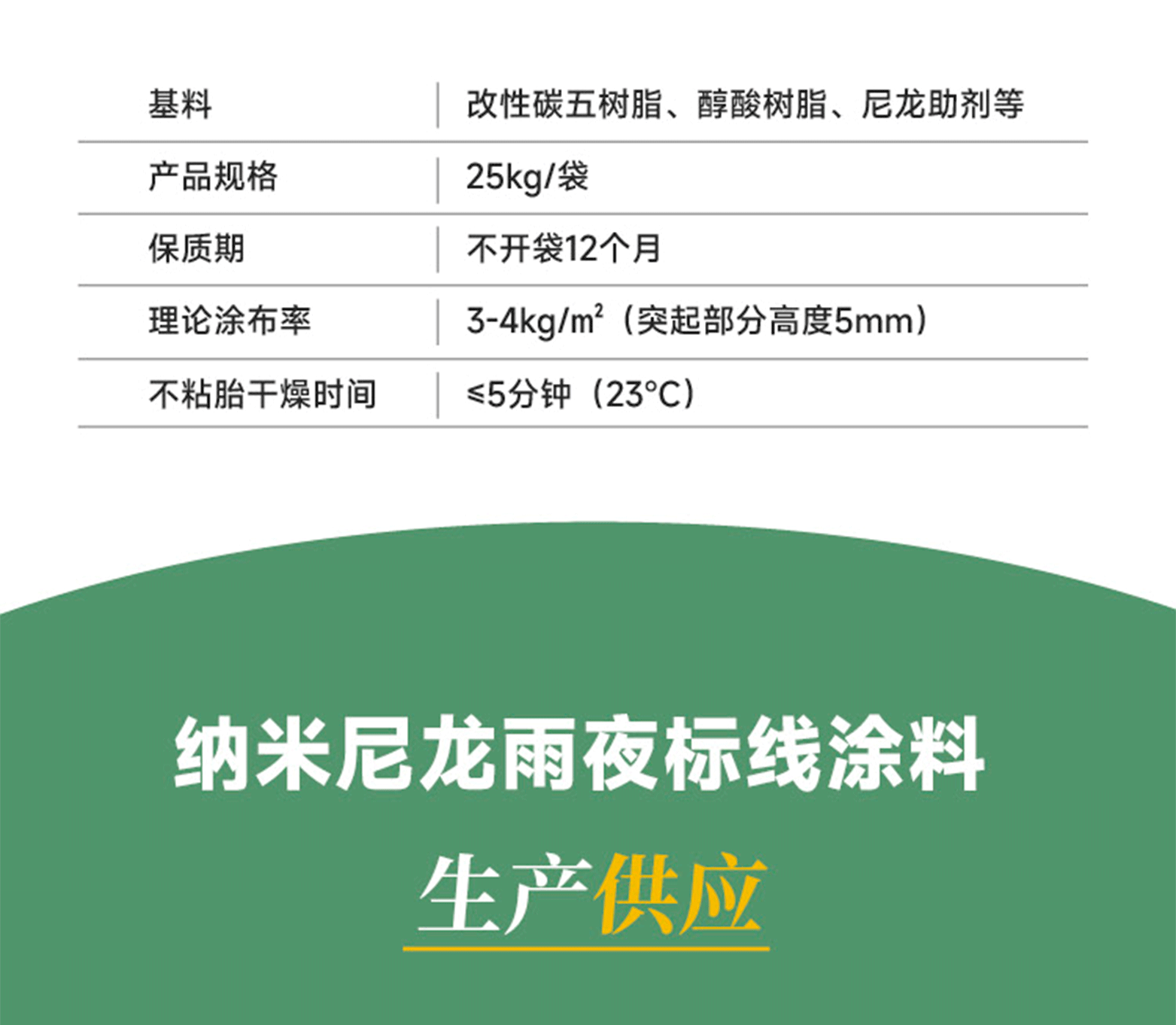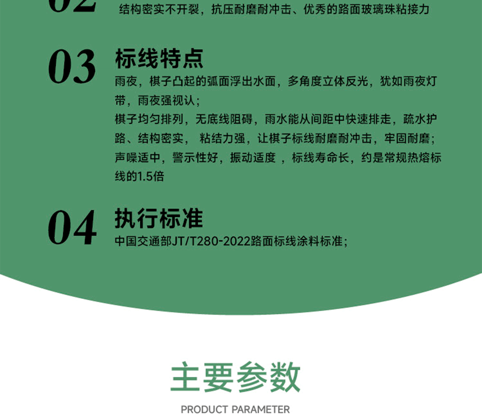 ?專家測評:納米尼龍雨夜標線涂料,結構密實不開裂,抗壓耐磨耐沖擊;雨夜,棋子凸起的弧面浮出水面,多角度立體反光,猶如雨夜燈帶,雨夜強視認;棋子均勻排列,無底線阻礙,雨水能從間距中快速排走,疏水護路、結構密實, 粘結力強,耐磨耐沖擊;標線壽命長,約是常規熱熔標線的1.5倍。