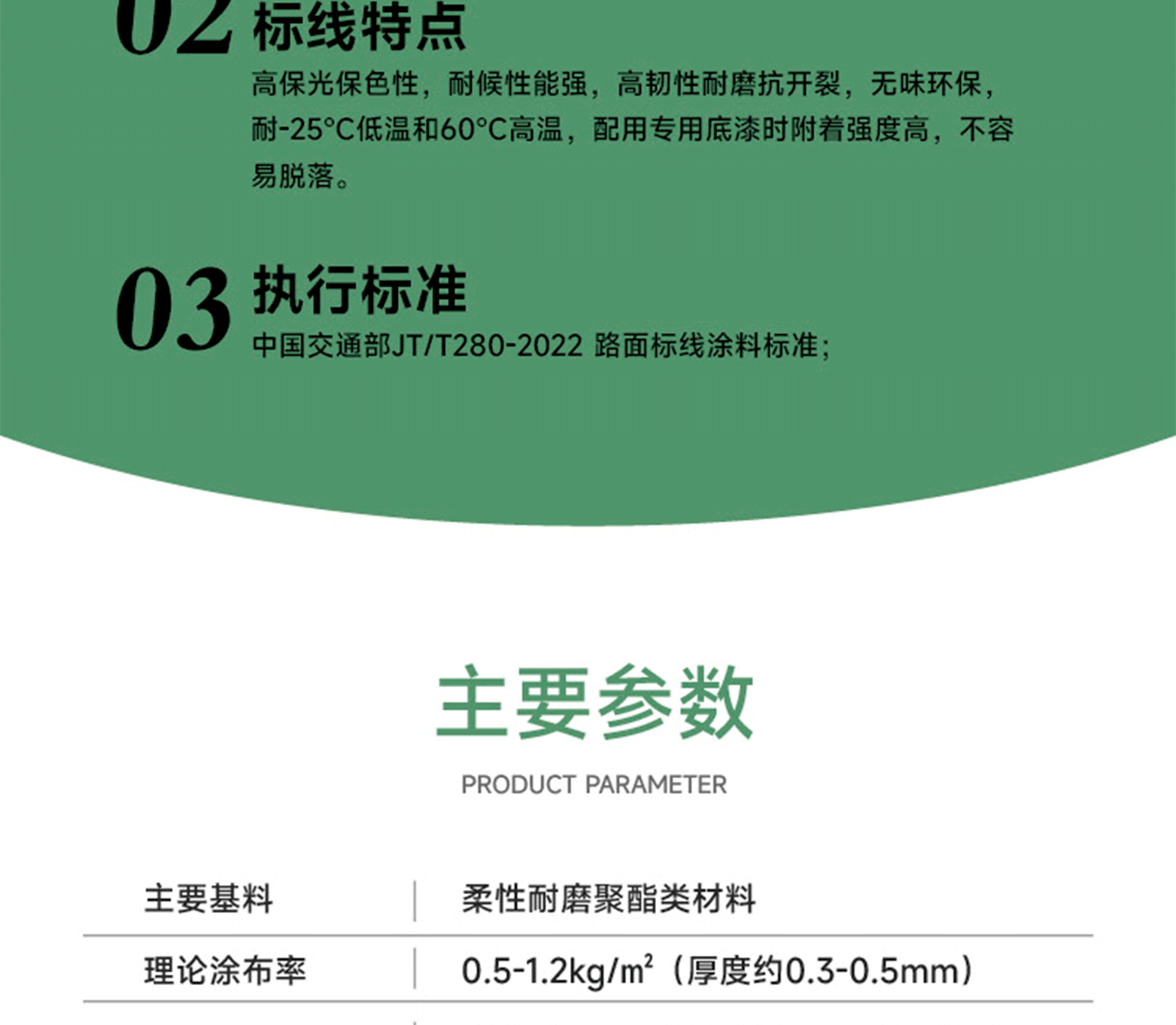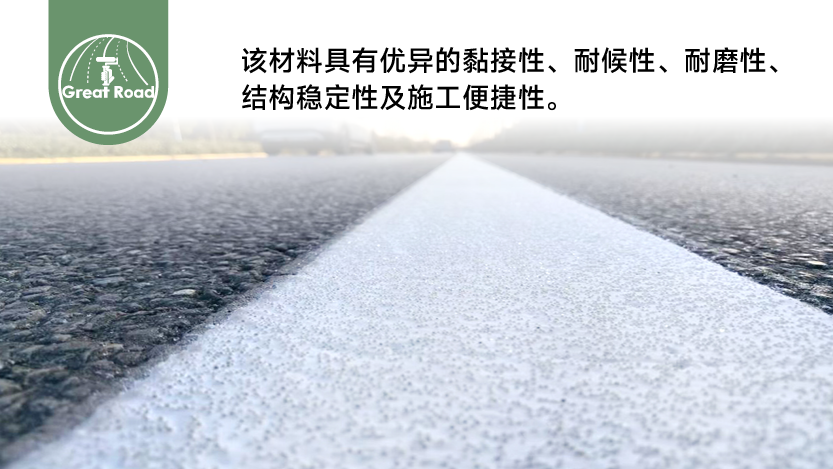 柔性聚酯樹脂、復配顏填料及多種功能性助劑,經特殊工藝制成的綠色耐磨反光標線材料。高保光保色性,耐候性能強,高韌性耐磨抗開裂,無味環保,耐-25℃低溫和60℃高溫