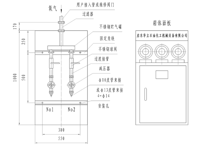 本氧氣點閥箱主要由氧氣過濾器、貯氣裝置、分流控制裝置、氧氣減壓器、出氣接頭(束接)和箱體組成。箱體背面有4-Φ14的安裝孔,可供掛壁安裝。箱體正面板上安裝有進氣壓力表和各出氣分壓力表,可將來自氧氣源的高壓氧氣經過濾潔凈后方便地調節至所需的使用壓力,同時供一把或多把切割槍使用。