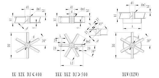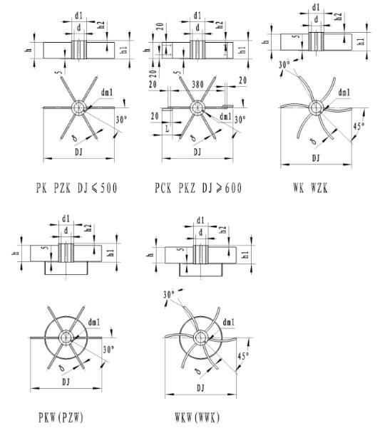 注:寬葉葉片寬h=0.2DJ;窄葉葉片寬h=0.125DJ。