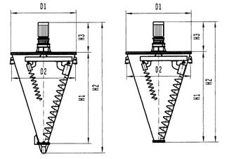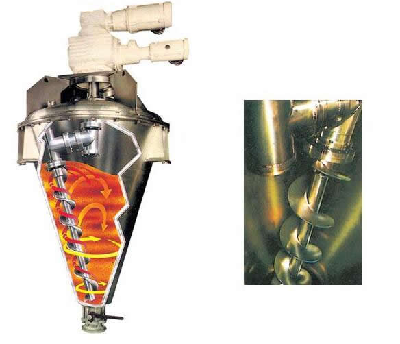本機主要由錐形筒體、螺旋軸、傳動機構及出料部件等組成。物料由上部加入,電機帶動特制擺線針輪減速機,使螺旋軸系統作公轉和自轉,大螺旋軸緊靠筒壁小螺旋軸靠近中心,兩螺旋軸同時作行星運動。將物料自下而上提升,形成沿錐形筒壁上升的物料流。同時轉臂帶動螺旋軸公轉,使螺旋體外的物料混入螺旋體內,整個錐形筒體內物料不斷錯位提升、相互摻混。由錐形筒體中心匯合向下流動。由于該機的三重混合作用,使物料能在較短時間內達到混合均勻。