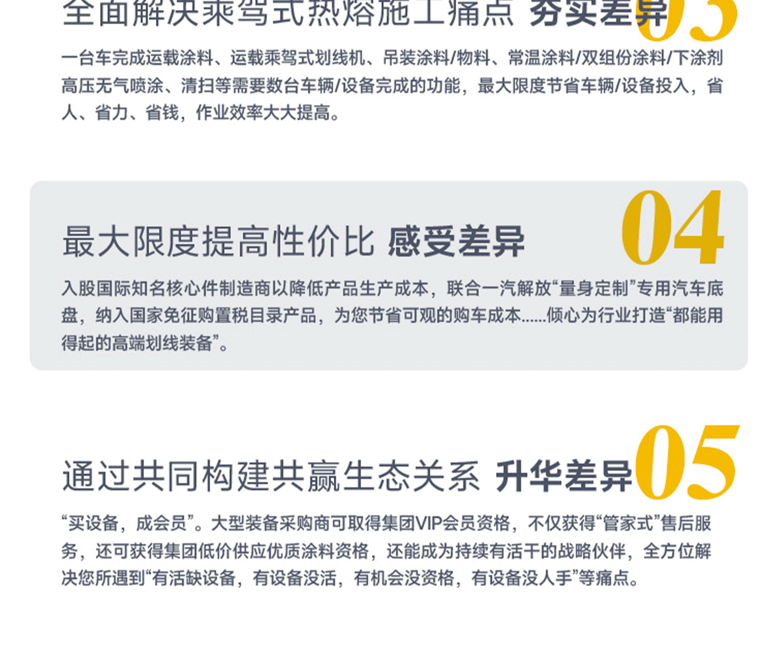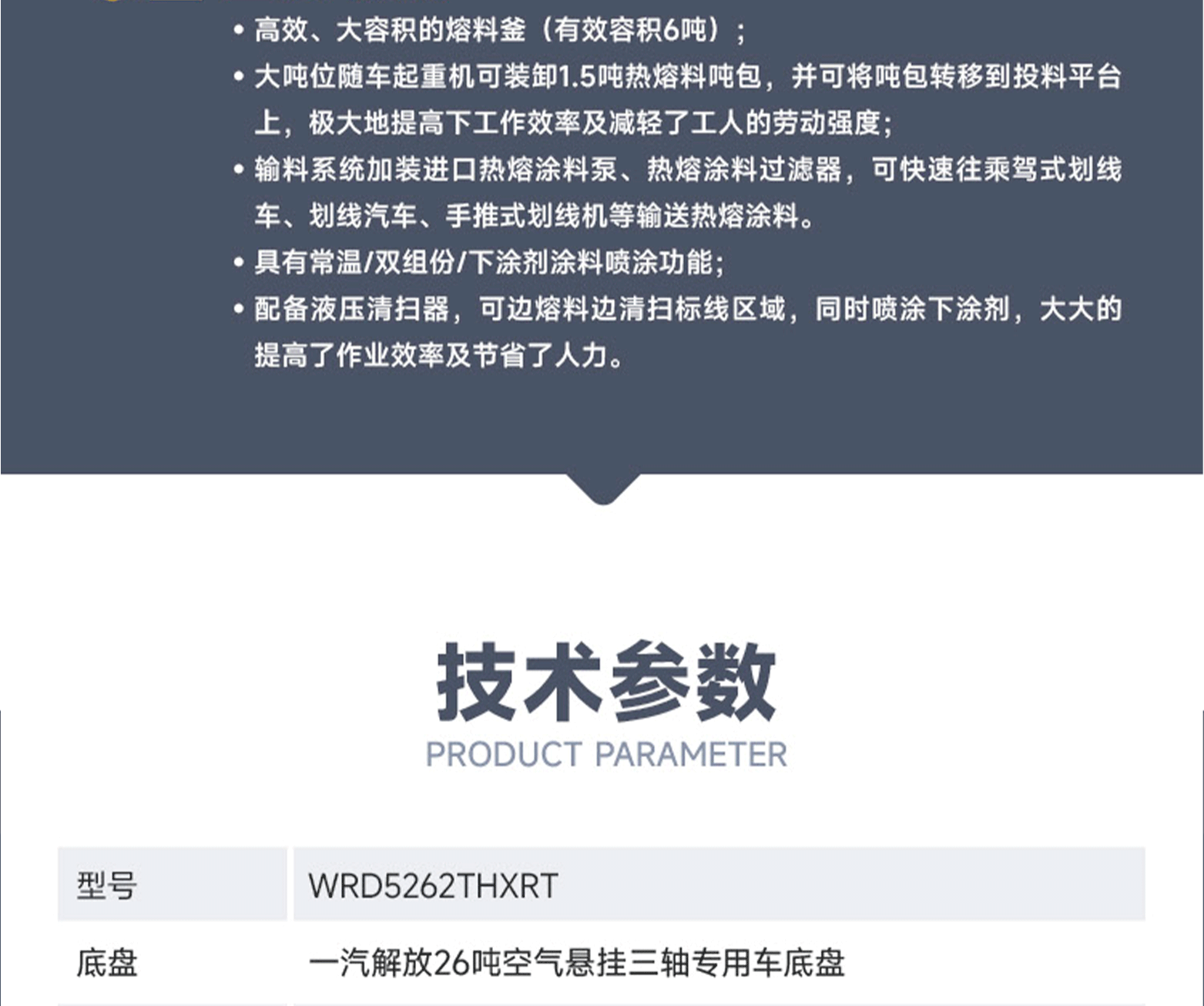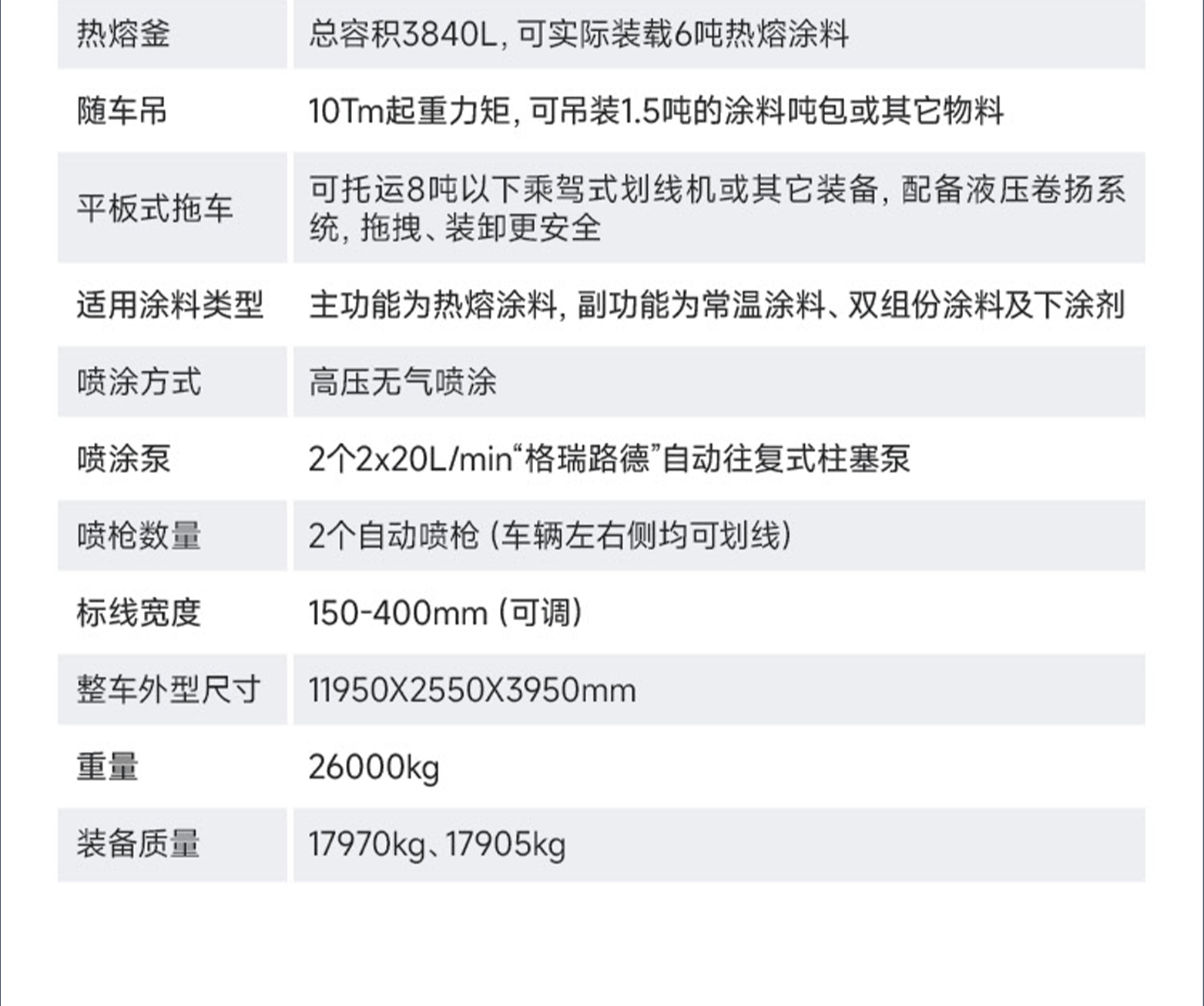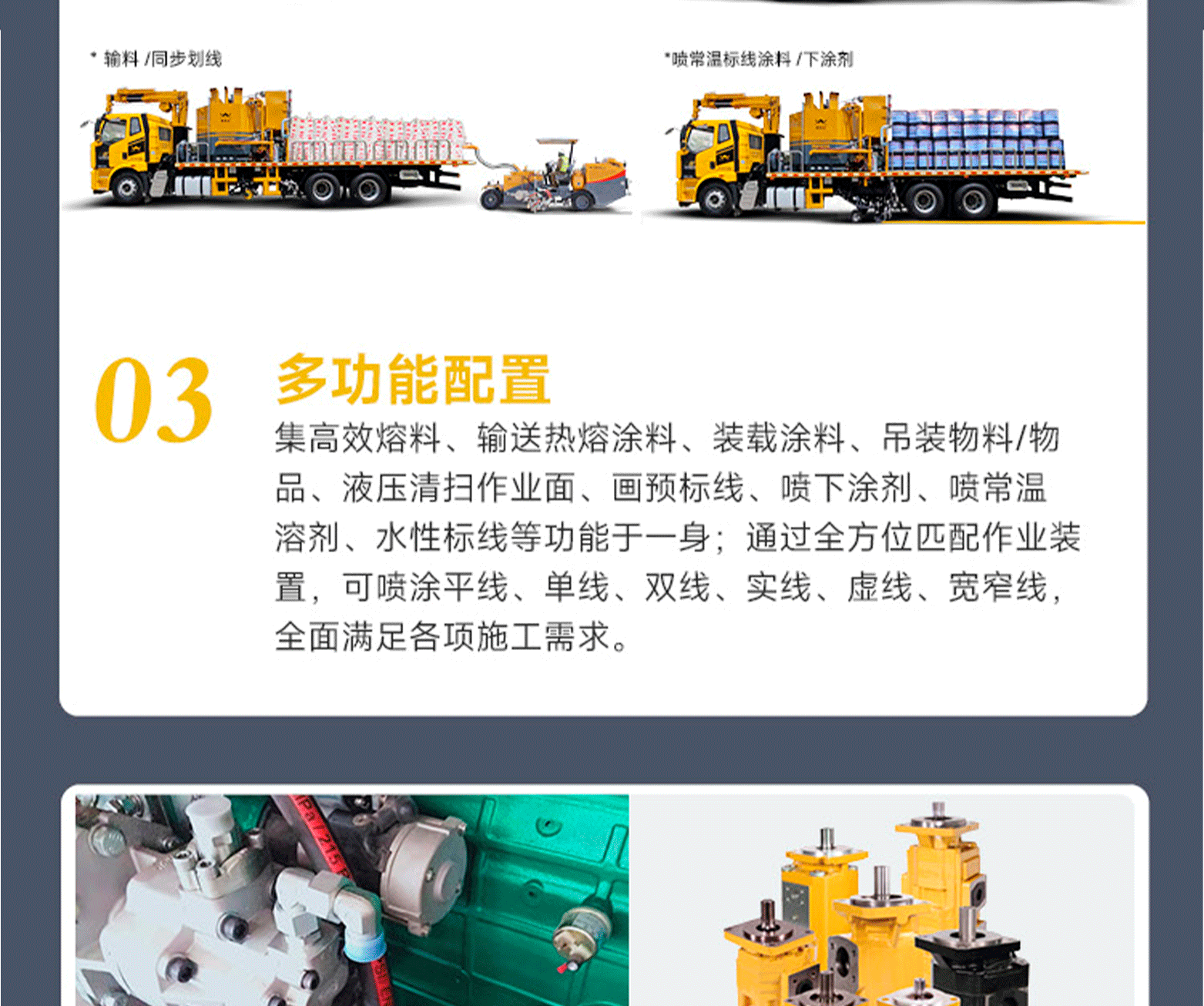 ?專家測評:高效、大容積的熔料釜(有效容積6噸);大噸位隨車起重機可裝卸1.5噸熱熔料噸包,并可將噸包轉移到投料平臺上,極大地提高下工作效率及減輕了工人的勞動強度;輸料系統加裝進口熱熔涂料泵、熱熔涂料過濾器,可快速往乘駕式劃線車、劃線汽車、手推式劃線機等輸送熱熔涂料。具有常溫/雙組份/下涂劑涂料噴涂功能;