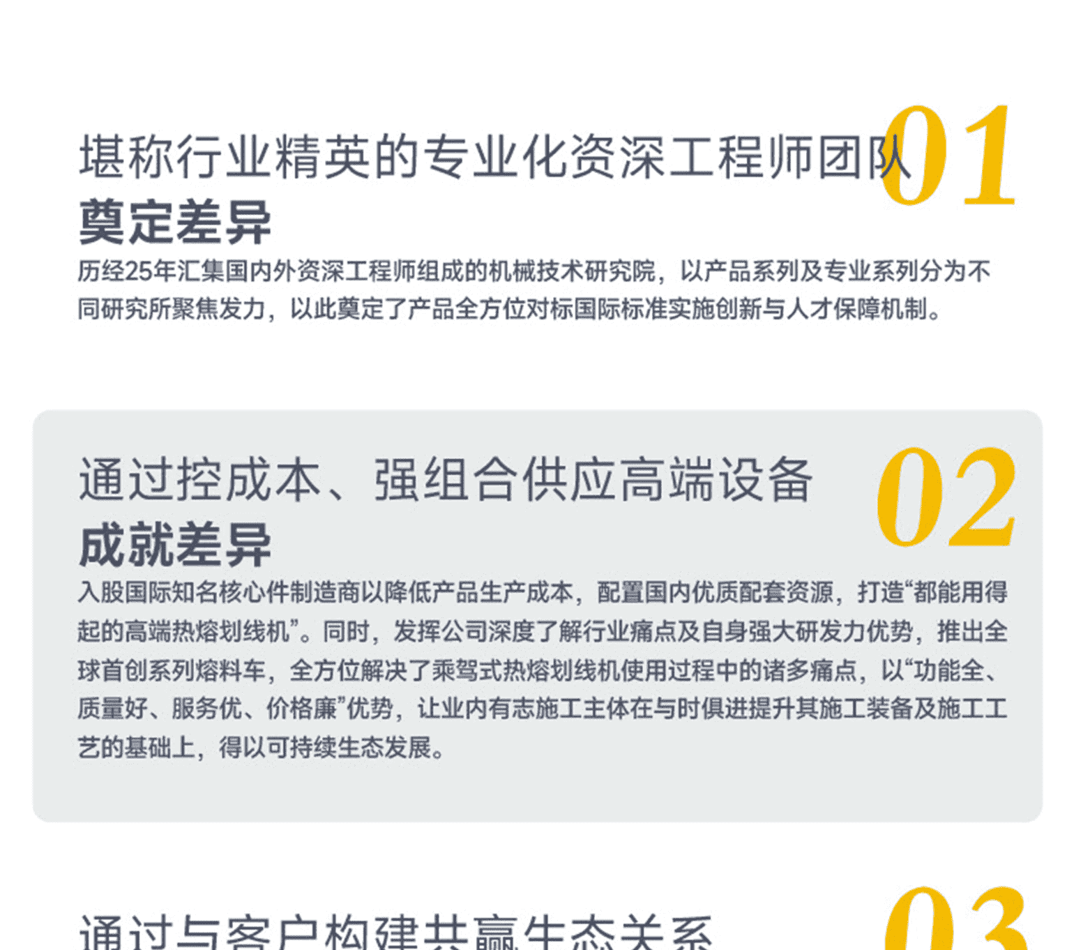 ?專家測評:核心品質(zhì):驅(qū)動系統(tǒng)穩(wěn)定易操作、進口液壓件、易操作式人機對話、熱熔釜導熱油式穩(wěn)定保溫;主要特點:刮敷施劃熱熔平線及震蕩線、擠壓施劃平線、劃線端更換方便、易維護、劃線效率高;