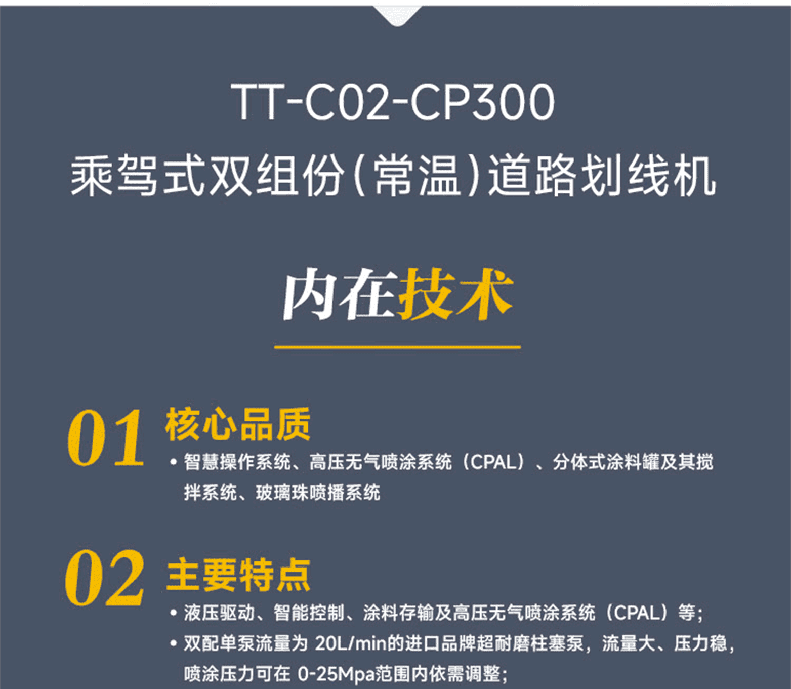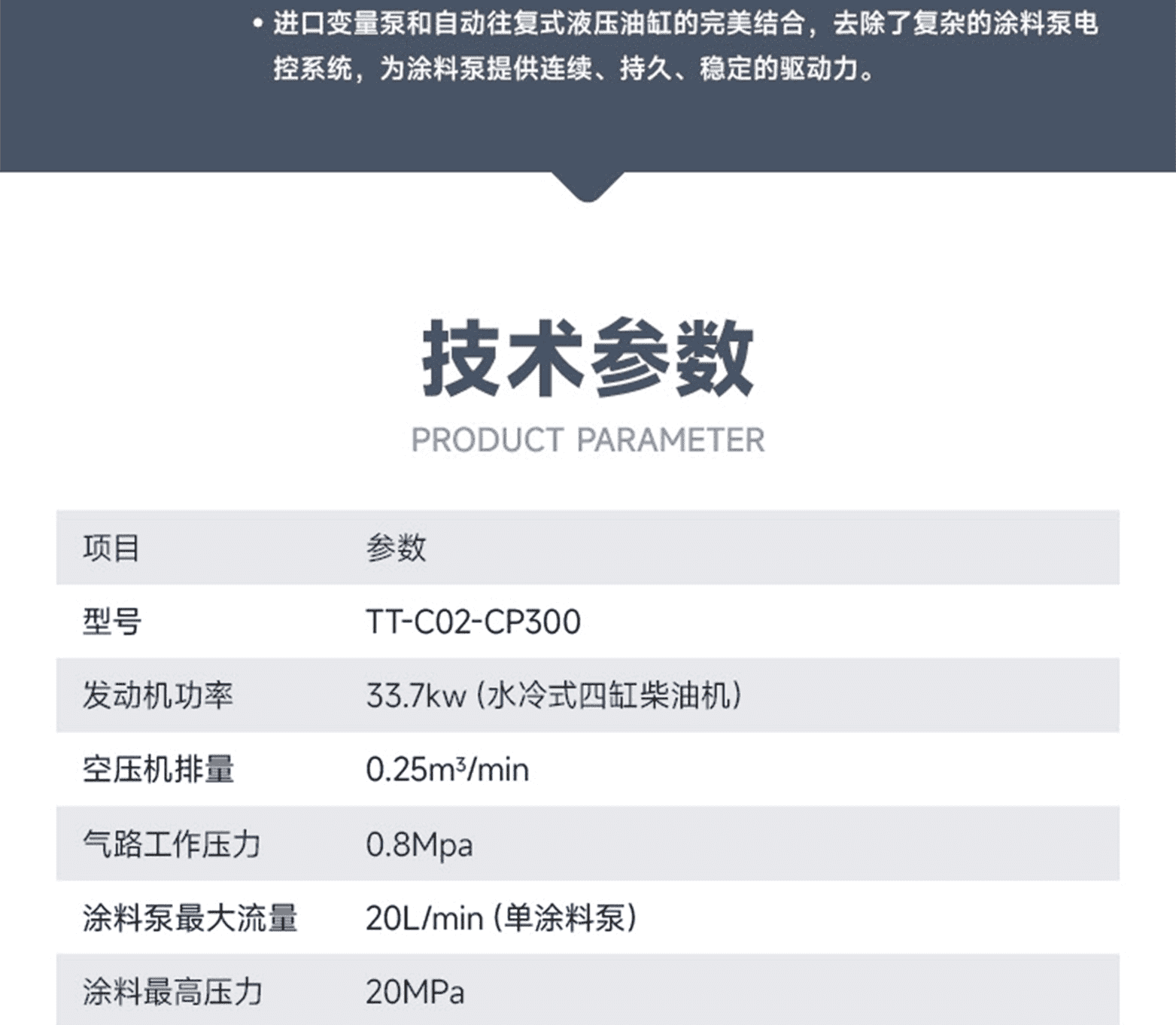 ?專家測評:液壓驅動、智能控制、涂料存輸及高壓無氣噴涂系統(CPAL)等;雙配單泵流量為 20L/min的進口品牌超耐磨柱塞泵,流量大、壓力穩,噴涂壓力可在 0-25Mpa范圍內依需調整;進口變量泵和自動往復式液壓油缸的完美結合,去除了復雜的涂料泵電控系統,為涂料泵提供連續、持久、穩定的驅動力。