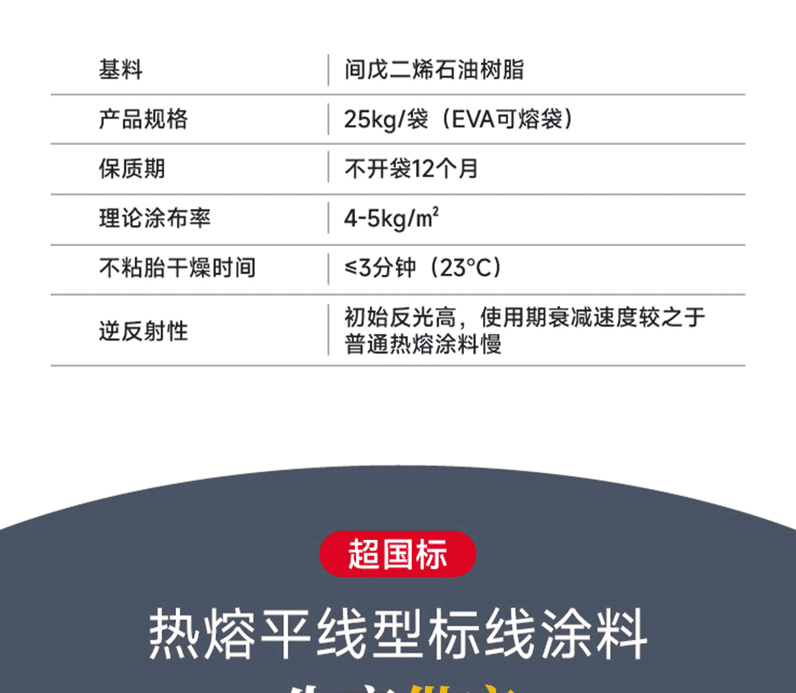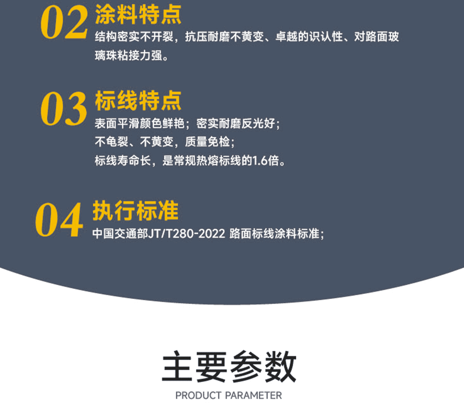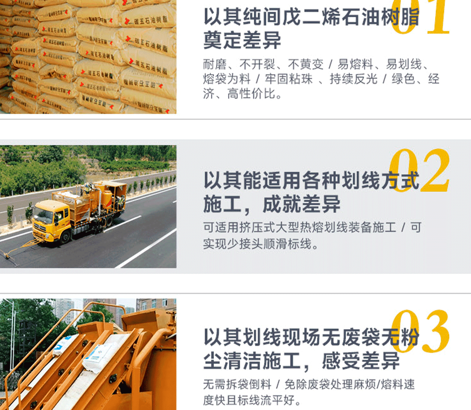 涂料特點:結構密實不開裂,抗壓耐磨不黃變、卓越的識認性、對路面玻璃珠粘接力強。標線特點:表面平滑顏色鮮艷;密實耐磨反光好;不龜裂、不黃變,質量免檢;標線壽命長,是常規熱熔標線的1.6倍。
