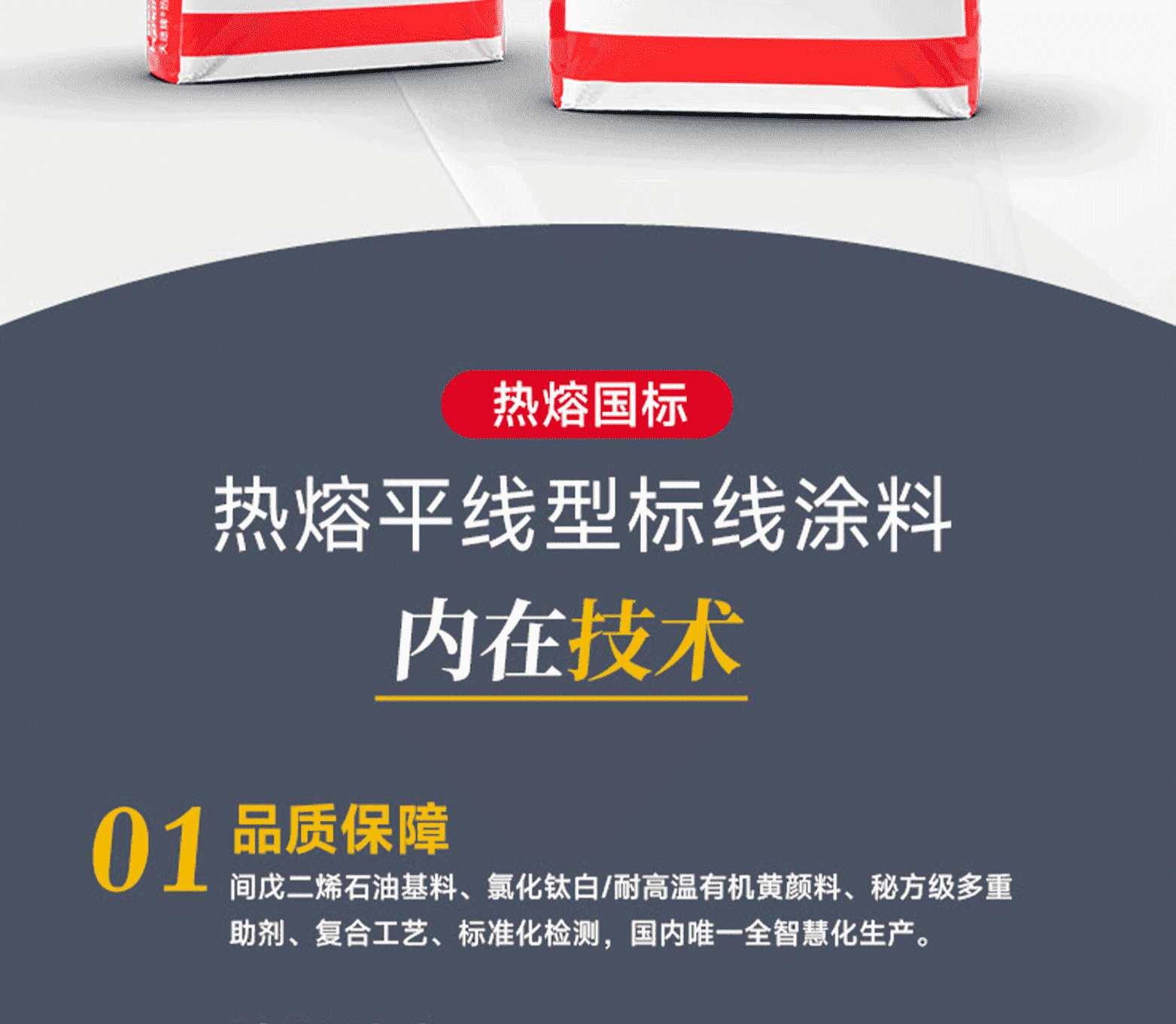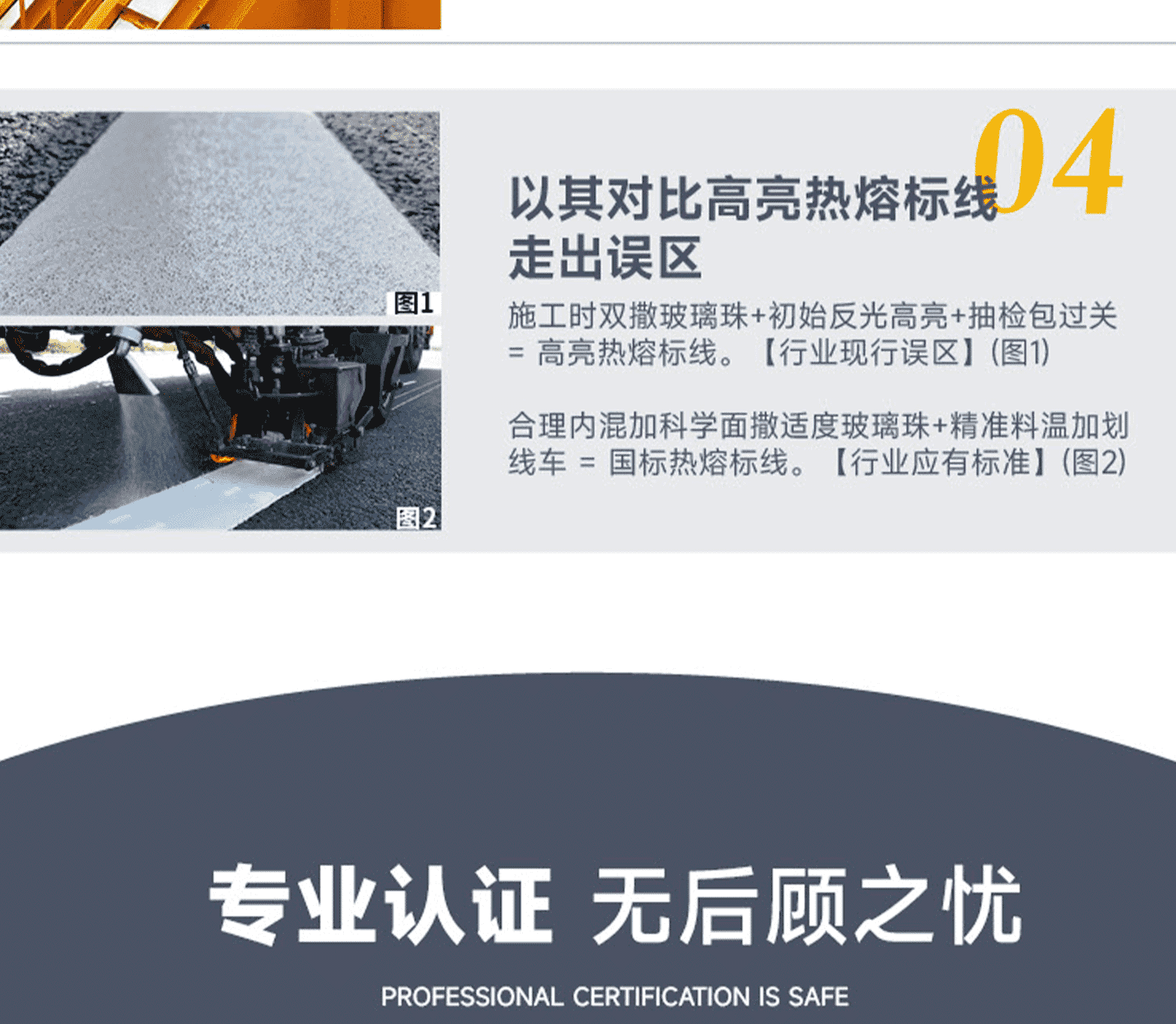 涂料特點:結構密實不開裂,抗壓耐磨不黃變、卓越的識認性、對路面玻璃珠粘接力強。標線特點:表面平滑顏色鮮艷;密實耐磨反光好;不龜裂、不黃變,質量免檢;標線壽命長,是常規熱熔標線的1.6倍。