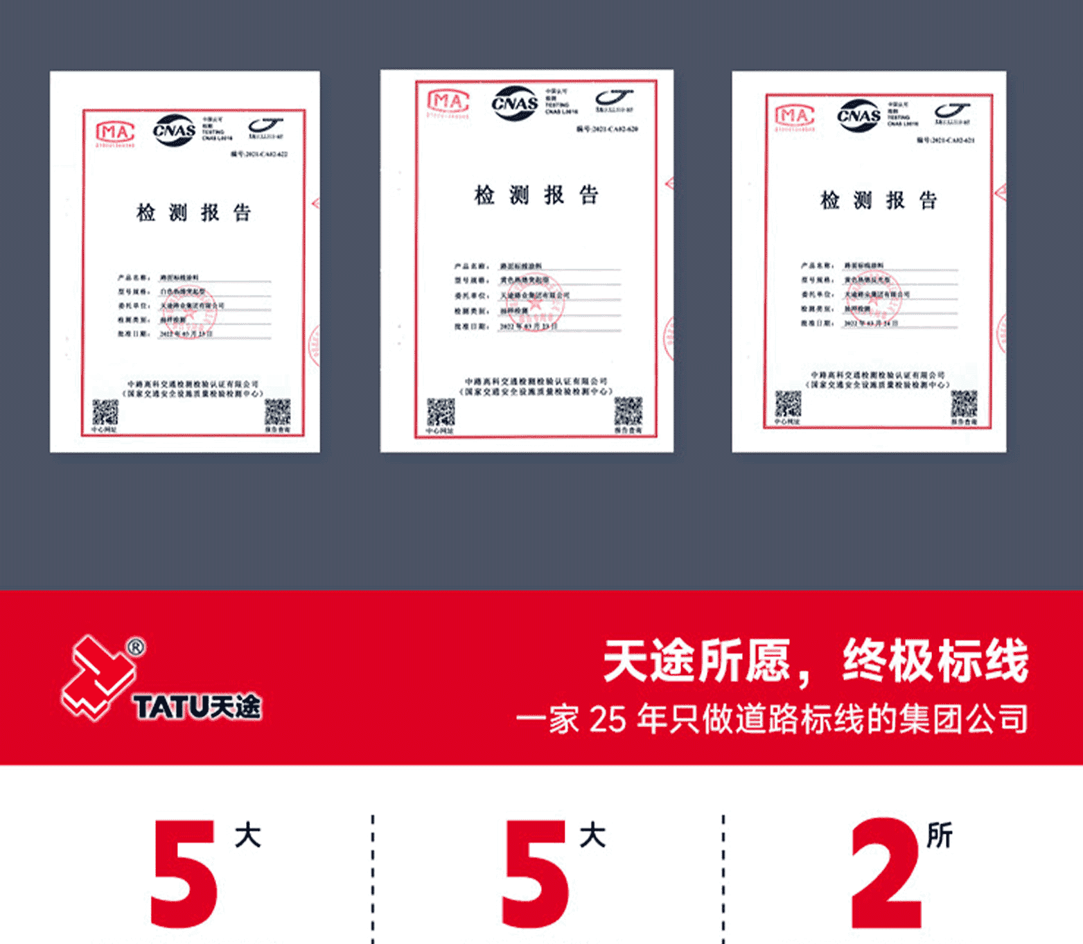 涂料特點:結構合理、混合均勻、質量一致性高 / 玻璃珠含量少 / 用途廣泛,使用方便。標線特點:表面平滑顏色鮮艷;密實耐磨反光好;不龜裂、不黃變,質量免檢;