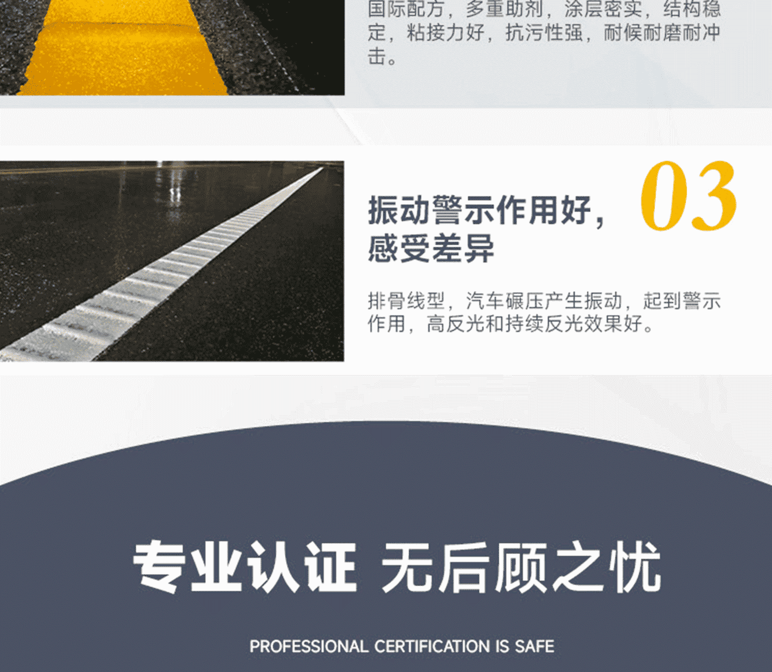 標線品質:進口基料、氯化鈦白/有機黃顏料、多重進口助劑、復合工藝、標準化檢測;標線特點:涂料細膩、抗污性強、覆蓋性高、耐磨耐候、施工性好、抗沉不起泡;