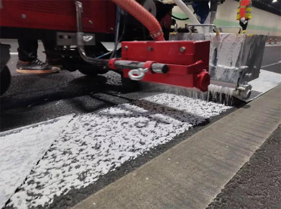 雙組份標(biāo)線是一種環(huán)境友好型標(biāo)線,其具有其它類型標(biāo)線難于比擬的反光性、耐侯性及耐磨性,且整個(gè)生命周期內(nèi)幾乎無(wú)粉塵磨耗,有效解決了傳統(tǒng)溶劑型標(biāo)線施工時(shí)有溶劑揮發(fā)、使用過程不耐磨及反光效果差,以及熱熔型標(biāo)線施工時(shí)耗費(fèi)燃料、使用過程磨耗大量粉塵漂浮空氣中等弊端。